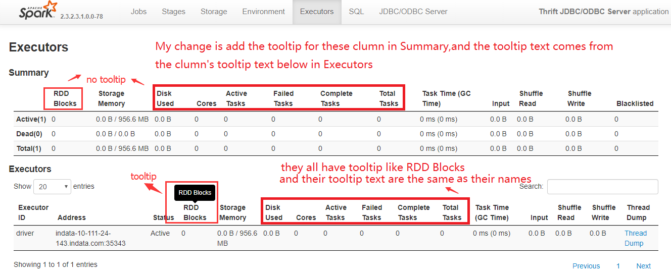 liucht-inspur commented on issue #25994: [SPARK-29323][WEBUI] Add tooltip for The Executors Tab's column names in the Spark history server Page URL: https://github.com/apache/spark/pull/25994#issuecomment-538210493 > Can one of the admins verify this patch? > I don't think that answers the question. What is the new tooltip that appears on what columns? Hello @srowen , I had screenshots and added comments, hope they are valuable to you,thanks!
