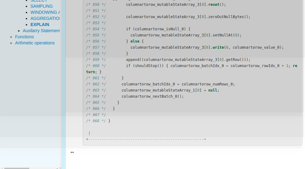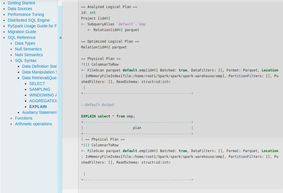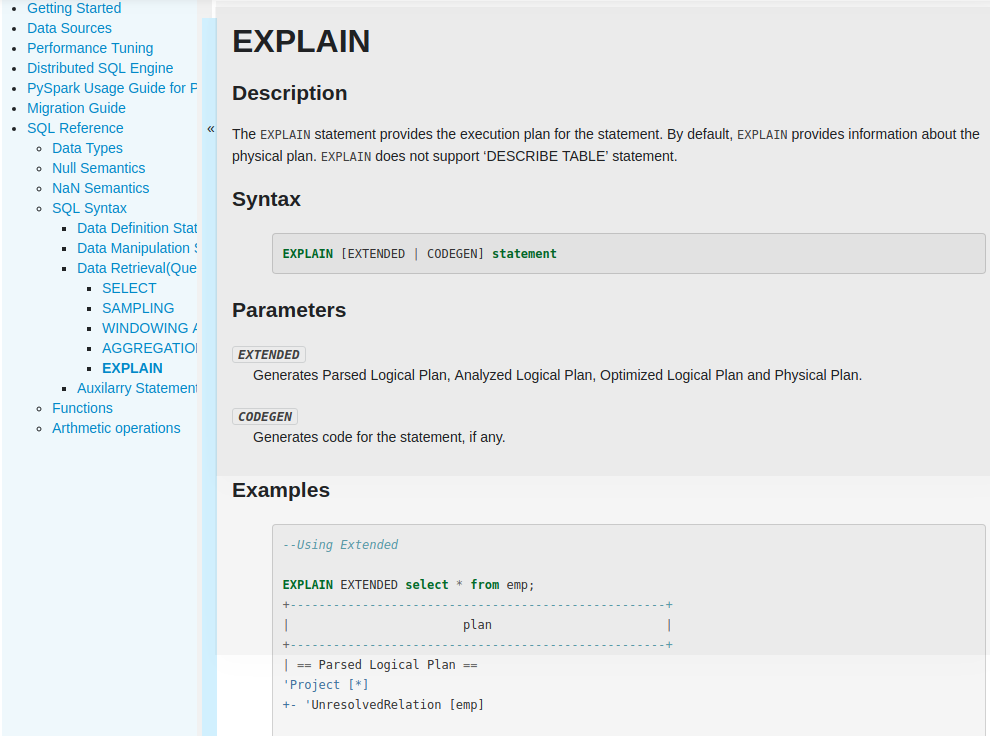 PavithraRamachandran opened a new pull request #26970: [SPARK-28825][SQL][DOC] Documentation for Explain Command URL: https://github.com/apache/spark/pull/26970 What changes were proposed in this pull request? Document Explain statement in SQL Reference Guide. Why are the changes needed? Adding documentation for SQL reference. Does this PR introduce any user-facing change? yes Before: There was no documentation for this. After:      How was this patch tested? Used jekyll build and serve to verify.