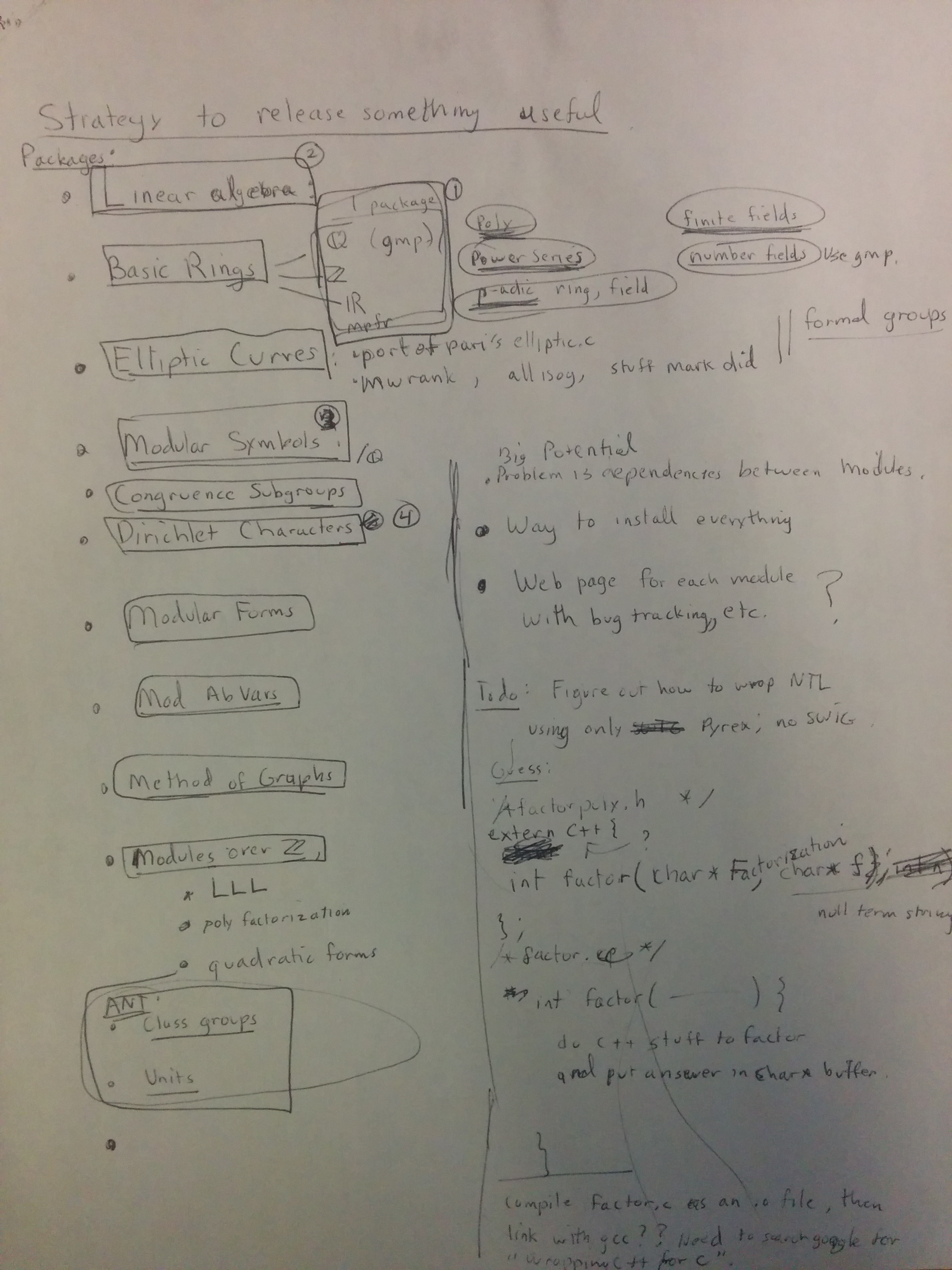 This was from about 10 years ago -- late 2004 -- it's my planning sheet from when I was first getting serious about "Sage" (then called Manin). -- William Stein Professor of Mathematics University of Washington http://wstein.org -- You received this message because you are subscribed to the Google Groups "sage-devel" group. To unsubscribe from this group and stop receiving emails from it, send an email to [email protected]. To post to this group, send email to [email protected]. Visit this group at http://groups.google.com/group/sage-devel. For more options, visit https://groups.google.com/d/optout.