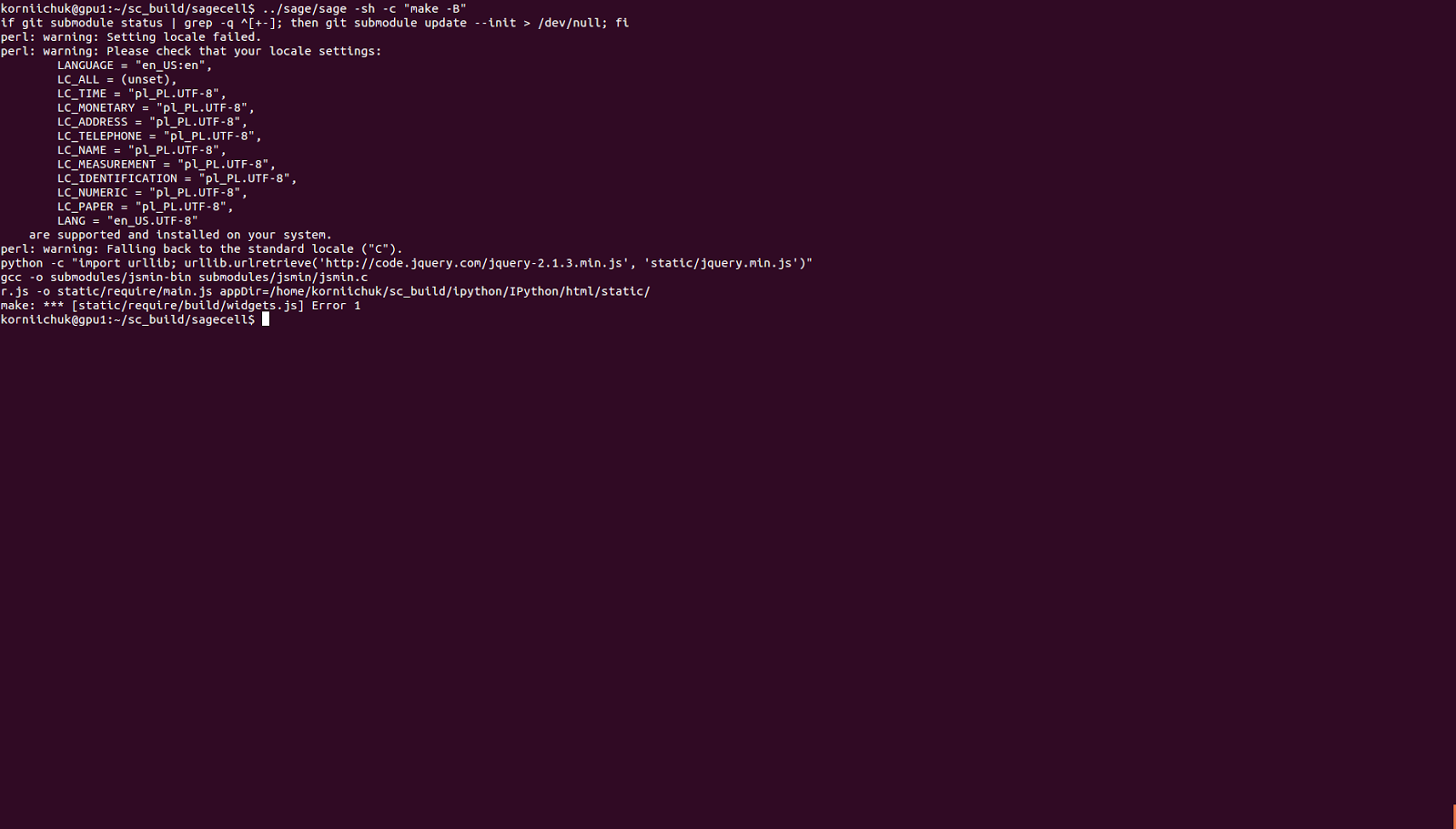 after new version of simple installation <https://github.com/sagemath/sagecell#simple-installation> *does not work installation on Ubuntu Server 14.04.1*: ``make: *** [static/require/build/widgets.js] Error 1`` Terminal *screenshot here*: https://goo.gl/wZQn95 Can you help me? Best regards Ruslan Korniichuk <https://lh3.googleusercontent.com/-5otvseAcPTM/VhggAQFPWCI/AAAAAAAAAPs/QQgyi0QDI0Y/s1600/ubuntu_server.png> -- You received this message because you are subscribed to the Google Groups "sage-support" group. To unsubscribe from this group and stop receiving emails from it, send an email to [email protected]. To post to this group, send email to [email protected]. Visit this group at http://groups.google.com/group/sage-support. For more options, visit https://groups.google.com/d/optout.