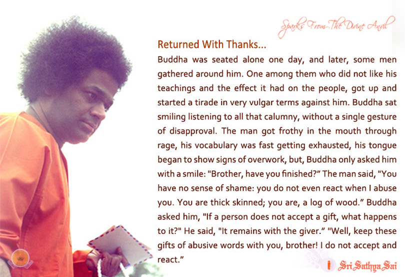 Baba Was Quicker… <http://www.sssbpt.org/images/BabaWasQuicker.jpg> <http://www.theprasanthireporter.org/2014/04/baba-was-quicker/> Baba Was Quicker… Tuesday, April 22nd, 2014 Take refuge at His Feet with all out surrender and the rest will be done. With surrender God ‘steps out’ from within stepping into the situation bailing you out of the tricky situation. A story from Kerala, as published in the April 1971 issue of Sanathana Sarathi. …a story from Kerala The family of Sethu Madhavan Nair, about eight miles away from the house where a few months back Naxalites committed the most gruesome killings received a threatening letter from them, on 1- 3-71. The faimly felt that the Namasankirtan was their only shield. They decided on Akhanda Namabhajan for a week, six days, during day-light hours and on the seventh day, all the twenty-four hours! The valedictory function was celebrated with immense joy and the atmosphere was most inspiring. Baba Was Quicker… <http://www.sssbpt.org/images/returnedwiththanks.jpg> It must be mentioned that Baba has been revealing His presence by miraculous manifestations in the shrine room of the house. This must have been the immediate reason for the ire that was aroused in the hearts of atheists and votaries of violence. On the 8th, at 5 A.M., when Sethu Madhavan was near the washbasin at the back of the house, by the side of an open window, a fellow appeared at the window, and threw with fatal force a heavy choffer on the man! But, Baba was quicker! He drew the devotee suddenly to the corner of the room, away from the fatal blow, holding him quick round the body. He actually had the feel of Baba, drawing him away! The choffer fell with a clang on the floor; Vibhuti had dropped all over the place. Baba Was Quicker… <http://www.sssbpt.org/images/thestreamoflove.jpg> sourced: <http://www.theprasanthireporter.org/2014/04/baba-was-quicker/> http://www.theprasanthireporter.org/2014/04/baba-was-quicker/ <https://fbcdn-sphotos-h-a.akamaihd.net/hphotos-ak-prn2/t1.0-9/10308254_641948715894270_6649848522758846786_n.jpg> SRI SATHYA SAI ARADHANA MAHOTSAVAM 2014: PROGRAMME SCHEDULE Loving Sairam! Radio Sai team is pleased to announce the schedule of ‘Sri Sathya Sai Aradhana Mahotsavam’ which will commence from tomorrow 23rd April 2014. The two day programme will conclude on 24th April 2014. ... Here is the complete schedule of the Programme for 23rd April and 24th April, 2014 at Prasanthi Nilayam for all Radiosai listeners and Radiosai facebook followers. ........................................................................................................................................................................ Wednesday, 23rd April 2014 Morning 8.00 am: Veda Recital 9.00 am: Bhajans followed by Mangala Arathi Evening 5.00 pm: Veda Recital 5.30 pm: Programme of Contemporary Indian Music by Sri A. S. Ram and his Group 'Pulse' 6.30 pm: Bhajans followed by Mangala Arathi Thursday, 24th April 2014 Morning 8.00 am: Veda Recital 8.20 am: Traditional Offering of “Krithis on Swami” by students of SSSIHL 8.50 am: Address by Sri S. Gurumurthy, Contemporary Social and Economic Thinker 9.20 am: Address by a Trustee of the Sri Sathya Sai Central Trust 9.30 am: Bhagawan’s Discourse 9.45 am: Bhajans followed by Mangala Arathi 10.15 am: Narayan Seva and Vastram distribution at Sri Sathya Sai Hill View Stadium Evening 5. 00 pm: Veda Recital 5.30 pm: Musical Concert by Pandit Debashish Bhattacharya and Party 6.30 pm: Bhajans followed by Mangala Arathi You can watch all these programs live from Sai Kulwant Hall through our Live Webcast on our website <http://l.facebook.com/l.php?u=http%3A%2F%2Fwww.radiosai.org.%2F&h=lAQFYDnVN&enc=AZNFzKZFX0NwfpSahzypklFKBJCoBCs-c17jYepFtJGSMVtqCW5YzFYAAhg-nqcmwRK8rMvUHl2jmqq8SgLem_9os7eNEhl0QtGTeDZuDM5uvAhmE7E9AvIFWpkA_dX04d2uJkUlJtUM5vbrp71jfKiv&s=1> www.radiosai.org. Thank you and loving Sai Ram, Team Radio Sai link also at: http://media.radiosai.org/journals/vol_12/01APR14/aradhana-festival-at-prasanthi-nilayam-program-schedule-april-24-2014.htm <https://fbcdn-sphotos-a-a.akamaihd.net/hphotos-ak-ash3/t1.0-9/1926629_641788389243636_392438207712839347_n.jpg> Download the special poster of Summer Showers 1990 Illustrated - Discourse 1 and read the full discourse here: <http://media.radiosai.org/journals/vol_12/01MAR14/SUMMER-SHOWERS-ILLUSTRATED-1990-DISCOURSE-01.htm> http://media.radiosai.org/journals/vol_12/01MAR14/SUMMER-SHOWERS-ILLUSTRATED-1990-DISCOURSE-01.htm <https://fbcdn-sphotos-g-a.akamaihd.net/hphotos-ak-ash3/t1.0-9/10153900_641788285910313_111795966105512992_n.jpg> Why is selfless service so vital to a spiritual life? Bhagawan answers the question with an illustration, explaining the benefits of service for us today. Today’s Sai Inspires from Prasanthi Nilayam, Tuesday, April 22, 2014 The Gita advises that service to the society (Sangha) is the highest service (Seva), as well as the most beneficial spiritual discipline (Sadhana). No one ...can run away from this obligation; you have to use the community wherein you are born for sublimating your ego and saving yourself. Service taken up as a Sadhana teaches fortitude (Sahana). That is why Krishna directed Arjuna to engage in battle to win back his share of the Kingdom, and ensure for the people righteous administration and an atmosphere wherein they can strive successfully to attain salvation. This he had to do in a spirit of dedication and surrender to the will of God, irrespective of his own likes and dislikes, and the consequences that might flow from his unselfish activities. Even Avatars (incarnations) demonstrate in their lives the supreme importance of Seva. - Divine Discourse, Jan 11, 1968. Loving service is a penance that promotes the practical application of your knowledge, skills and virtues. - BABA. Read here full discourse: <http://www.sssbpt.info/ssspeaks/volume08/sss08-01.pdf> http://www.sssbpt.info/ssspeaks/volume08/sss08-01.pdf Get 'Thought for th