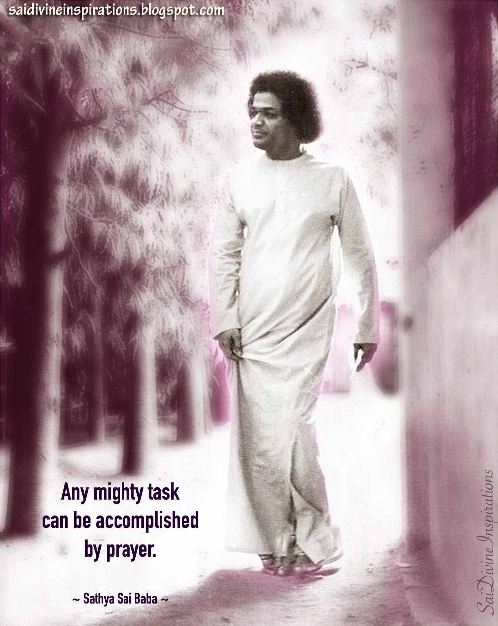 <http://4.bp.blogspot.com/-JoCiCKeF-AI/VA5ZJzCWyiI/AAAAAAAAucM/fUwWtedzCiw/s1600/E-101(give%2Bup%2Bdesires).jpg> Any mighty task can be accomplished by prayer. Hence, pray to God silently. Do not pray for the fulfillment of your petty desires. Give up all desires and pray to God wholeheartedly with love. You will certainly find fulfillment in life. You can understand and experience divinity only through love. Nothing can be achieved without love. Love makes all your tasks successful. (SS. Vol 48 - pg 2) Awaken the Divine within you... -- --- You received this message because you are subscribed to the Google Groups "saimsg" group. To unsubscribe from this group and stop receiving emails from it, send an email to [email protected]. For more options, visit https://groups.google.com/d/optout.