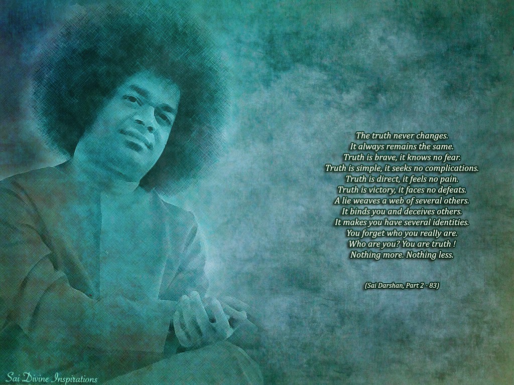 <http://4.bp.blogspot.com/-hU1P7HpaK4Q/VBLql8PA-7I/AAAAAAAAudA/YKg1CWniZno/s1600/SD2-83.jpg> The truth never changes. It always remains the same. Truth is brave, it knows no fear. Truth is simple, it seeks no complications. Truth is direct, it feels no pain. Truth is victory, it faces no defeats. A lie weaves a web of several others. It binds you and deceives others. It makes you have several identities. You forget who you really are. Who are you? You are truth ! Nothing more. Nothing less. >From : 'Sai Darshan' - Part II (Divine Messages received and recorded by Mrs Seema M Dewan) Awaken the Divine within you... <http://mail.yimg.com/us.yimg.com/i/mesg/tsmileys2/40.gif> Love All, Serve All <http://mail.yimg.com/us.yimg.com/i/mesg/tsmileys2/40.gif> -- --- You received this message because you are subscribed to the Google Groups "saimsg" group. To unsubscribe from this group and stop receiving emails from it, send an email to [email protected]. For more options, visit https://groups.google.com/d/optout.
