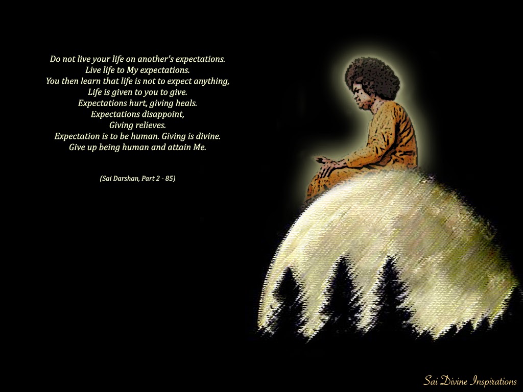 <http://3.bp.blogspot.com/-jv7e29ebk-c/VCOGf1uhZQI/AAAAAAAAuj8/je5t9r0qX_8/s1600/SD2-85.jpg> Do not live your life on another's expectations. Live life to My expectations. You then learn that life is not to expect anything, Life is given to you to give. Expectations hurt, giving heals. Expectations disappoint, Giving relieves. Expectation is to be human. Giving is divine. Give up being human and attain Me. >From : 'Sai Darshan' - Part II (Divine Messages received and recorded by Mrs Seema M Dewan) Awaken the Divine within you... <http://mail.yimg.com/us.yimg.com/i/mesg/tsmileys2/40.gif> Love All, Serve All <http://mail.yimg.com/us.yimg.com/i/mesg/tsmileys2/40.gif> -- --- You received this message because you are subscribed to the Google Groups "saimsg" group. To unsubscribe from this group and stop receiving emails from it, send an email to [email protected]. For more options, visit https://groups.google.com/d/optout.