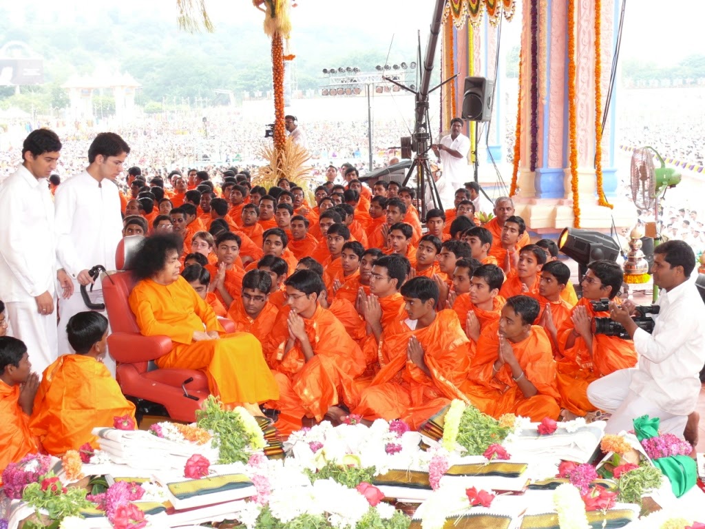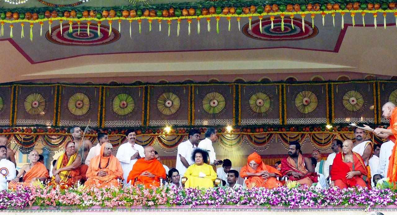 <https://1.bp.blogspot.com/-9_woM3sttkM/VGU_xpNsxlI/AAAAAAAAFXg/EDJ6t7Zgd6c/s1600/S%2B%2827%29.JPG> Sri Sathya Sai on the Golden Chariot on the Sahasra Poorna Chandra Darshan Mahotsavam Day Saturday, November 15, 2008 to Monday, November 17, 2008 There are certain events in the history of mankind which leave their imprint on the sands of time forever and became a source of inspiration and joy for all future generations of humanity. On such historic event was the three-day celebration of Sahasra Poorna Chandra Darshana Santhi function of the Kali Yuga Avatar Bhagavan Sri Sathya Sai Baba, entering 83rd year of His Advent on the earth on 23rd November, 2008, which was held from 15th to 18th November, 2008, in the Sri Sathya Sai Hill View Stadium, Prasanthi Nilayam. A Yajnashala was built over the Shanti Vedika in the stadium. A beautiful idol of Lord Venkateshwara was installed in the center of the stage. Twelve Yajna Kundas were set up on the Yajnashala for the performance of the Yajnas for the peace and welfare of the world. The chanting of Vedic Mantras and performance of the Yajnas were held in the Hill View Stadium on all the days, during the mornings. During the evenings on all the three days, renowned musicians offered their musical tributes to Bhagavan on this most auspicious occasion in Sai Kulwant Hall. <https://1.bp.blogspot.com/-5xVi5xO_gHI/VGU-3gI-Q7I/AAAAAAAAFXY/ovy-cvmfh9o/s1600/P1040140.JPG> Day 1 - When Sri Sathya Sai arrived at the Shanti Vedika On 15th November, 2008, the priests commenced the worship of Lord Venkateshwara amidst Vedic chanting on the stage a 7.45 am. The Chief Priest Sri Lakshmi Narayana Somayaji of Shringeri Sharada Peetham in his speech explained to the mammoth gathering of devotees the significance of this Yajna at 8.35 am. Bhagavan arrived in the Stadium amidst Vedic chants by the Priests and University Students. Five crackers were burst atop Hanuman Hill. On reaching the Yajna Shala, Bhagavan was offered traditional welcome with Poorna Kumbham. <https://4.bp.blogspot.com/-smv49DxGdwk/VGVBBFK_iGI/AAAAAAAAFX0/PDAIY-o58-M/s1600/P1160867.JPG> Swami giving Darshan to students and devotees on the Shanti Vedika Bhagavan blessed the devotees with His Divine Darshan from the Yajna Shala. The Yajna fire was produced traditionally at 9.25 am and after Bhagavan blessed it, the fire was placed in the Yajna Kunda amidst chanting of sacred Mantras. Thus commenced the Yajna in the Divine Presence of Bhagavan. Mangala Aarati was offered to Bhagavan at 10.25 am to mark the conclusion of the public programme. But the priests continued the Yajna till 12.30 pm and again from 3.30 pm to 6.30 pm. <https://2.bp.blogspot.com/-Rlt14WPAo_A/VGVAkPDAMpI/AAAAAAAAFXo/TSEZlS-peeY/s1600/ss%2B%2844%29.JPG> Day 2 - Sri Sathya Sai blessing the Linga Abhishekam On 16th November, 2008, the rituals of the Yajna commenced at 7.30 am in the Hill View Stadium. At 8.50 am Abishekam (ceremonial bathing) of Sayeeshwara Linga consecrated by Bhagavan during the Rudra Maha Yajna was done by the priests. Bhagavan arrived in the Stadium at 9.30 am and witnessed the Linga Abhishekam on the stage. Then He went around the Yajna Shala blessing the devotees with His Divine Darshan. After the Abishekam, Maha Mrityunjaya Homam was performed by the priests. Bhagavan sat by the side of the Yajna Kunda and watched the proceedings. <https://1.bp.blogspot.com/-ZdL6rA1yhPg/VGVBqyq38II/AAAAAAAAFX8/fWL9MRQHd9I/s1600/vs%2B%2863%29.JPG> Sri Ganapati Sachchidananda, Head, Dattapeetham, Mysore, along with Sri Sathya Sai at the Poornahuti of the Rudra Homam on Day 2 Sri Ganapati Sachchidananda Swami, the Head of Dattapeetham (Mysore), who had come to Puttaparthi to participate in this function, offered his greetings to Bhagavan. At 10.15 am, Bhagavan blessed the precious offerings for the Poornahuti of Maha Mrityunjaya Homam. He then materialised a gold chain and placed it among the precious offerings to be offered in the sacred fire. Poornahuti was performed amidst Vedic chants. The programme concluded with offering of Mangala Aarati to Bhagavan at 10.30am. <https://1.bp.blogspot.com/-6l3IGQMVa_4/VGVCOwJNkTI/AAAAAAAAFYI/rgcRcQ3l3Ho/s1600/P1170442.JPG> The procession led by students - Band and Vedam group leading the Golden Sun Chariot on the Final Day On 17th November, 2008, the proceedings of the final day of the function started at 7.30 am in Hill View Stadium amidst chanting of Vedic Mantras by the priests and Institute students. Broadcast of devotional songs and the poetic description of the event by Professor Anil Kumar and Dr. Madugula Nagaphani Sarma, added sanctity to the environment. It was a spectacle of unparalleled grandeur and glory when Bhagavan arrived in Hill View Stadium in a golden chariot in His sparkling yellow robe on the 17th morning, spreading His Divine Glory in all directions and filling the hearts of everyone with bliss. <https://3.bp.blogspot.com/-C-X_Gxgxoko/VGVDCT4ehHI/AAAAAAAAFYQ/h6uniwdyKLk/s1600/S%2B%2854%29.JPG> The Glorious spectacle - Sri Sathya Sai seated in the Golden Sun Chariot - November 17, 2008 He was led in a grand procession by the two bedecked elephants followed by the Brass Band of the University, Bhagavan’s beloved elephant Sathya Geeta, Nadaswaram players and Vedic chanting group of students. On arrival at the Yajnashala at 10.00 am, Bhagavan was offered traditional welcome with Poorna Kumbham. Many great saints from various Maths and Ashrams present on this occasion, greeted Bhagavan at the Yajashala. They included Sri Shivakumara Swamigalu, Head of the Siddhaganga Math, Tumkur; Sri Jagadguru Madhwacharya Mahasamsthana Pejawara Muthadeesha – Sri Vishwesha Tirtha; Sri Jagadguru Kanchi Kamakoti Peetathipathi – Sri Jayendra Saraswati Swamigal; Sri Shivarathri Deshikendra Mahaswamiji, Suttur Math; Sri Sri Rangapriyta Mahadesika; and Sri Sakthiamma, Sripuram Golden Temple, Sri Narayani Peetham. <https://4.bp.blogspot.com/-DX5ESUo-F0E/VGVD9NZRsnI/AAAAAAAAFYY/O5ZO6bMiUr