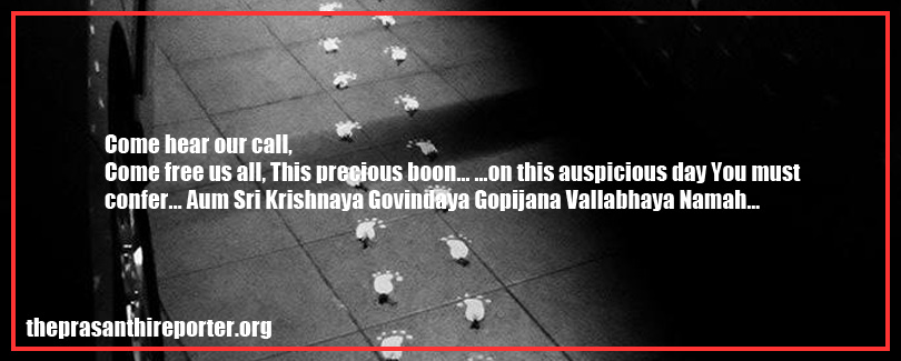 Aum Sri Krishnaya Govindaya Gopijana Vallabhaya Namah… <http://www.sssbpt.org/images/2015/ComeFreeUsAll.jpg> <http://www.theprasanthireporter.org/2015/09/come-free-us-all/> Aum Sri Krishnaya Govindaya Gopijana Vallabhaya Namah… Saturday, September 5th, 2015 Fulfilling His promise during the Dwapara, Krishna returns in the nick of time to lift man from dire peril. He Who has come back as Sri Sathya Sai walked amongst us… loving all of us, leaving no stone unturned in ‘serving’ and thus saving His folks. On the occasion of Sri Krishna Janmashtami, let’s join once again, fervently praying to the Supreme Incarnate – to come and lift us all up – to eternal freedom. A poem from Sri Jullie Chaudhuri. Yada Yada Hi Dharmasya Glanir Bhavati Bharata Abhyutthanam Adharmasya Tadatmanam Srjamy Aham Whenever there is a decline in dharma… …and a spiraling escalation in unrighteousness, You, Oh Krishna… …mercifully hear… …the anguished pleas of humanity in distress… …even as Mother Earth does piteously lament, You graciously consent… And…blaze forth in a wondrous Advent… Earth expresses gratitude for this Celestial Favour, Humanity is blessed with a Divine Flavour… You – the Palanhar… You – the Supreme Saviour… Aum Sri Krishnaya Govindaya Gopijana Vallabhaya Namah… Paritranaya Sadhunam Vinasaya Ca Duskrtam Dharma Samsthapanarthaya Sambhavami Yuge Yuge To come to the rescue… …as well as… …enhance and elevate… …the status of those deprived, downtrodden… …and oppressed… …to annihilate… …the wicked… …to reestablish equity, justice… …and uphold the dignity of Truth… Your words pledge an Advent… …A sacrosanct Descent… Varied Names…Wondrous Forms… Manifestations anew… Oh! Beloved Krishna… You…You…You… …eons through… …all else fades away…into an insignificant blur… Aum Sri Krishnaya Govindaya Gopijana Vallabhaya Namah… A few droplets of adoration, …reverentially caressed Your petal soft Feet, As Yamunaji paused and did You greet, On that magnificently glorious midnight, She had received a Cosmic Treat… …nothing could with her bliss compete… Waves splashed in hushed murmurs… …As she drew back her waters… …offering obeisance from all other rivers… …creating a pathway for Vasudeva… …as he carried You to Gokul… …in great awe she marvelled at the destiny that was delightfully hers… Hallowed tales… …that would eventually drench myriad exalted scriptures… So much joy Your Presence does auger… Aum Sri Krishnaya Govindaya Gopijana Vallabhaya Namah… My being too remains… …forever suspended… …embracing Your Essence within… …a state of pause…a timeless freeze… Your cherished Name… …my soul ceaselessly repeats… While, Your Image settles perennially clasped… …between two heartbeats… …tears of longing gush forth to lovingly envelope… …Your Lotus Feet… Kindly pay heed, …as creation does passionately plead… …and soulfully entreat… As did the gopis, the cowherd boys… …the cows and calves, monkeys and birds, …the forests and Tulsi shrubs, Hear the appealing words of Govardhan… …and all of Brindavan… …in ardent and spontaneous unison… About time, Beloved Lord, bestow melody sublime, The rhythm of Your flute… …sweet glimpses of You… …the sound of Your Voice… …in the arid material sphere… Grant us resplendent moments to rejoice… Come hear our call, Come free us all, This precious boon… …on this auspicious day You must confer… Aum Sri Krishnaya Govindaya Gopijana Vallabhaya Namah… Aum Sri Krishnaya Govindaya Gopijana Vallabhaya Namah… <http://www.sssbpt.org/images/2015/ComeFreeUsAll~.jpg> sourced: <http://www.theprasanthireporter.org/2015/09/come-free-us-all/> http://www.theprasanthireporter.org/2015/09/come-free-us-all/ _____ <http://www.theprasanthireporter.org/2015/09/sri-sathya-sai-moblile-hospital-10/> Sri Sathya Sai Mobile Hospital @ 10… Saturday, September 5th, 2015 Imagine a group of medicos taking a ‘holistic’ break from their roaring medical practices, engaging themselves in holy, selfless Medicare activities. The genesis of Sri Sathya Sai Mobile Hospital talks about this modern moving ‘miracle’ of selfless love, purely inspired by Bhagawan Sri Sathya Sai Baba. Sri Sathya Sai Mobile Hospital @ 10… <http://www.sssbpt.org/images/2015/sssmh@10_1.jpg> The much ‘lauded’ service ideal called Sri Sathya Sai Mobile Hospital is completing 10 years of service this year. Celebrating the grand occasion, the tireless team of SSSMH team presented a programme on the genesis and growth of this ideal service institution this evening here, in Prasanthi Nilayam. Sri Sathya Sai Mobile Hospital @ 10… <http://www.sssbpt.org/images/2015/sssmh@10_2.jpg> Sri Sathya Sai Mobile Hospital Programme was launched on March 30, 2006 by the Holy Hands of Bhagawan Sri Sathya Sai Baba. This service is operational from the 1st to 12th day of every month at 12 nodal points (base villages) drawn from 6 mandals from Anantapur district, with each of the 12 nodal points serve several surrounding villages. It is said, this mammoth project is covering over 5,00,000 population. Sri Kamineni Srinivas, Hon’ble Minister of Health, Medical Education & Family Welfare, the Chief Guest for the evening, presided over the function. Dr L.V. Subramaniam, IAS, Special Chief Secretary of Medical Education and Dr Nalini Mohan, Commissioner. AYUSH were the other dignitaries present, representing the government. Sri Sathya Sai Mobile Hospital @ 10… <http://www.sssbpt.org/images/2015/sssmh@10_3.jpg> Commencing the proceedings, Dr Narasimhan, Director, Sri Sathya Sai Mobile Hospital gave a detailed oral demonstration of the salient features of the role model service project. Sri Sathya Sai Mobile Hospital @ 10… <http://www.sssbpt.org/images/2015/sssmh@10_4.jpg> Rededicating this most ‘outreach’ form of Medicare, as he pre