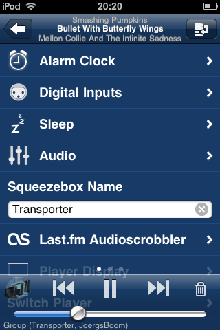 Wie? Das verstehe ich jetzt nicht. a) es funktioniert. b) was meinst Du mit "100% gleich"??? Wenn Du in iPeng die selbe Musik auf einem anderen Player hören willst, syncst Du den halt 'rein. Das ist einfach. Wenn Du den ersten nicht mehr hören willst, kannst Du ihn z.B. ausschalten oder wieder de-synchronisieren. > > Die Funktionsweise von SwitchPlayer trifft unser Bedürfnis halt ztu > 100%. > Dann nimm's doch :) Wie gesagt: es geht. > > Aber du sagst auch dass das Plugin aufgerufen werden kann. Was bedeutet > denn im Player-Context-Menu? Der Menüpunkt steckt normalerweise ja unter > Extras->SwitchPlayer (bzw. Hauptmenü->SwitchPlayer wenn man es so > konfiguriert). Wie wäre denn der Menüweg in IPeng? > Das ist der Weg: 1. NowPlaying Bildschirm [image: http://penguinlovesmusic.de/wp-content/gallery/ipeng-1-2/IMG_0231.PNG] 2. Player-Menü [image: http://penguinlovesmusic.de/wp-content/gallery/ipeng-1-2/IMG_0232.PNG] 3. Player-Kontextmenü [image: http://penguinlovesmusic.de/wp-content/gallery/ipeng-1-2/IMG_0271.PNG] Da ist dann "Switch Player" drin (Du siehst es unten durchscheinen). iPeng hat die Player-Einstellungen ohne tiefe Hierarchie direkt beim Player und nicht nur im Haupmenü. So hast Du alles, was mit ein/aus/sync/watauchimmer zu tun hat an einer Stelle zusammen. > > Könnte man sich da auch nen Shortcut ins Hauptmenü legen? > Nein, das Hauptmenü in iPeng ist noch nicht frei konfigurierbar. Das ist auch ein bisschen schwierig weil es auf dem iPhone für diese Art der Menüs eine Limitierung der Anzahl der Menüpunkte gibt. Und die ist so schon sehr sehr knirsch. -- pippin --- see iPeng, the Squeezebox iPhone remote, at penguinlovesmusic.com ------------------------------------------------------------------------ pippin's Profile: http://forums.slimdevices.com/member.php?userid=13777 View this thread: http://forums.slimdevices.com/showthread.php?t=79344