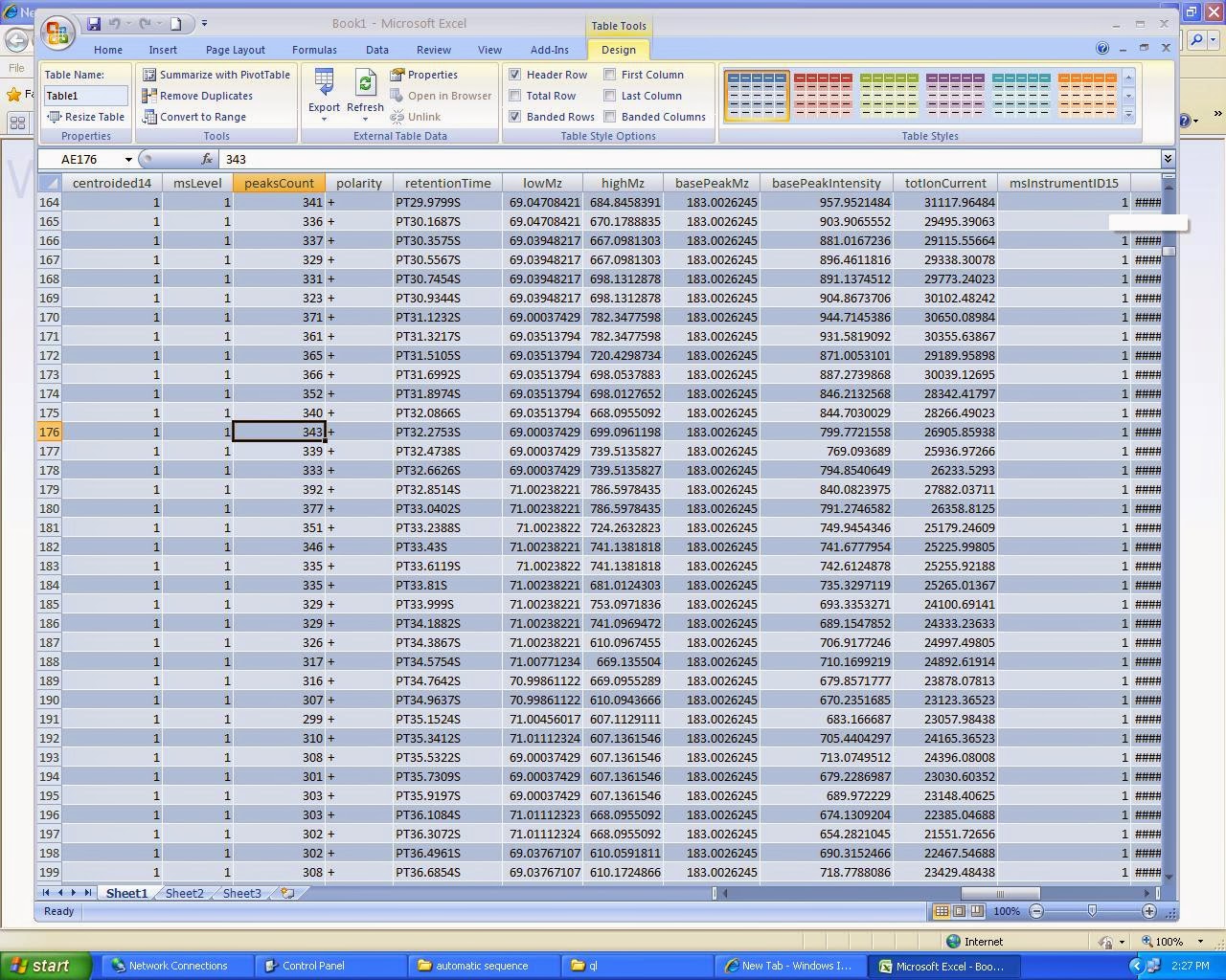 Dear all, I need to get the intensity values for peaks with defined m/z values at various retention times from hundreds of thermo RAW file. I am thinking to convert the RAW files into mzxml files, and then extract these values from the mzxml files. I tried to open a mzxml file with excel and to display the xml table.
