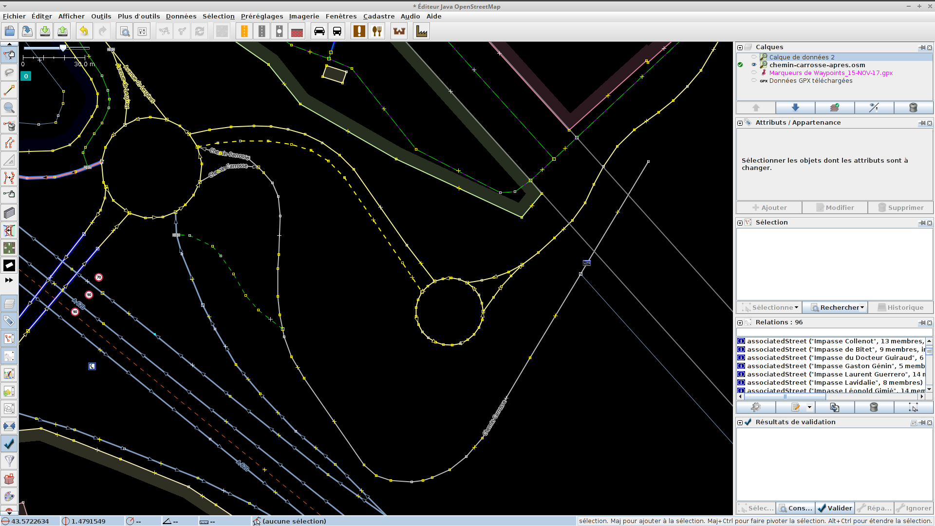 Le 16 novembre 2017 à 00:16, Sébastien Dinot <[email protected]> a écrit : > Bonsoir, > > Après avoir fait un relevé GPS ce soir, je viens de réaliser la > modification suivante : > > http://www.openstreetmap.org/changeset/53822434 > > Il s'agissait de prendre en compte un nouveau rond-point et le nouveau > tracé du « Chemin Carrosse » qui en résulte. > > Pour que vous puissiez vous faire une idée claire de la modification > opérée, j'ai effectué deux captures d'écran : > > * avant : https://www.palabritudes.net/~zebulon/chemin-carrosse-avant. > png > > * après : https://www.palabritudes.net/~zebulon/chemin-carrosse-apres. > png > > L'une des voies est encore marquée en construction car c'est le cas mais > une fois les travaux terminés, les deux voies seront à sens unique et > séparées par un terreplein. > > Jusque-là, pas de souci, je suis raisonnablement sûr de mon fait. > > Par contre, deux lignes de bus passent par le chemin Carrosse et j'ai > donc du les modifier, sachant que : > > * c'est la première fois que je m'attaque aux lignes de bus et je sais > que ces relations sont très fragiles ; > > * les voies à sens unique ne doivent être associées qu'à deux des > quatre relations ; > > * deux arrêts de bus (qui apparaissent sur la première capture > d'écran), ont été déplacés vers le nord-est. > > Du coup, si une âme charitable pouvait vérifier que je n'ai pas fait de > bêtise, je lui en serais reconnaissant. > > Merci par avance, > > Sébastien > > > -- > Sébastien Dinot, [email protected] > http://sebastien.dinot.free.fr/ > Ne goûtez pas au logiciel libre, vous ne pourriez plus vous en passer ! > > _______________________________________________ > Talk-fr mailing list > [email protected] > https://lists.openstreetmap.org/listinfo/talk-fr >