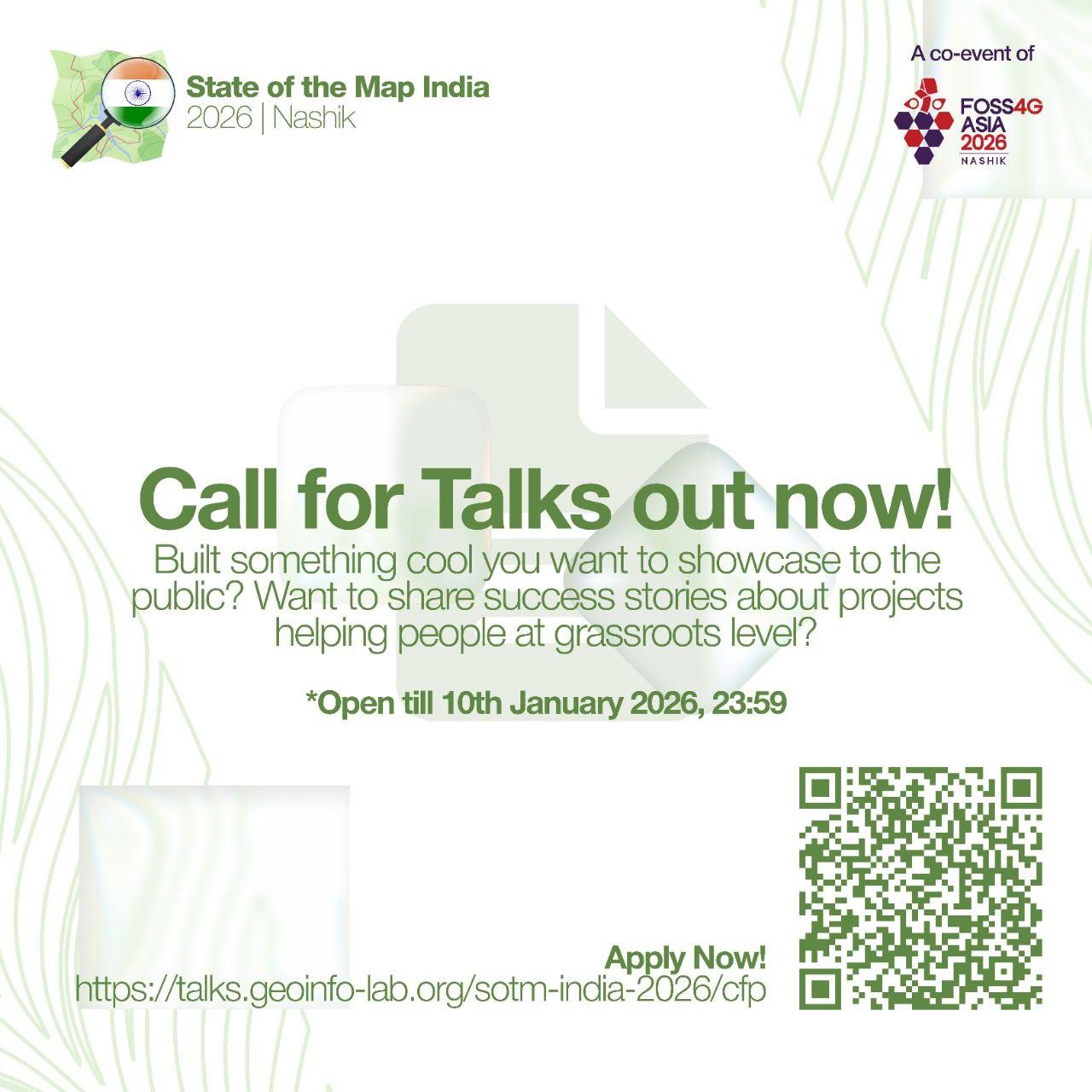 Tickets can be booked at https://www.openstreetmap.in/sotm-india/Talk proposals can be submitted at https://talks.geoinfo-lab.org/sotm-india-2026/cfp (open till 10th Jan).