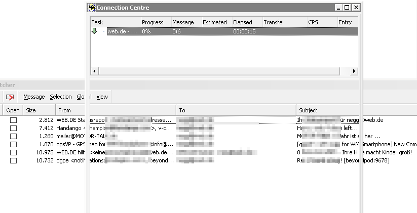 Strange thing: since 4.0.31 I get this emtpy connection manager window, where the window below "shines through" (actually the pixels get stuck, i.e. when I move the CM-Window, the "screenshot" inside moves along. So whats missing is the list of sent/received mails. I already removed the registry key "connection manager" to reset the position, no change. Anyone else experiencing this? -- Martin TB! 4.0.34 on Windows XP 5.1 Service Pack 3 ________________________________________________________ Current beta is 4.0.34.11 | 'Using TBBETA' information: http://www.silverstones.com/thebat/TBUDLInfo.html