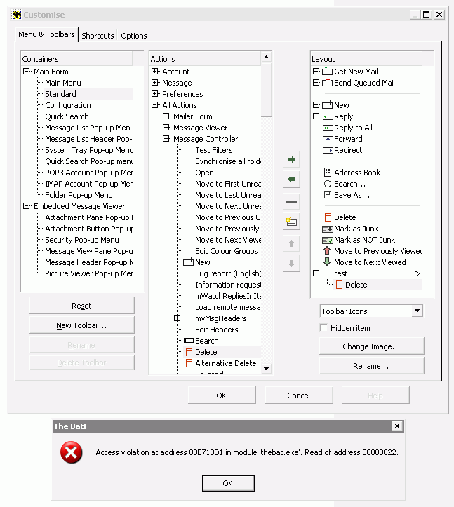 I tried that (see the item "test" and its child entry "delete" in the screenshot) and got an access violation when pressing the ok button: http://www.aspekt1.net/ms/temp/tbAVCustomizer.gif Subsequently the TB toolbar was messed up until I restarted TB. Can anyone confirm this? -- Martin TB! 3.80.03 on Windows XP 5.1 Service Pack 2 ________________________________________________ Current version is 3.71.03 | 'Using TBUDL' information: http://www.silverstones.com/thebat/TBUDLInfo.html