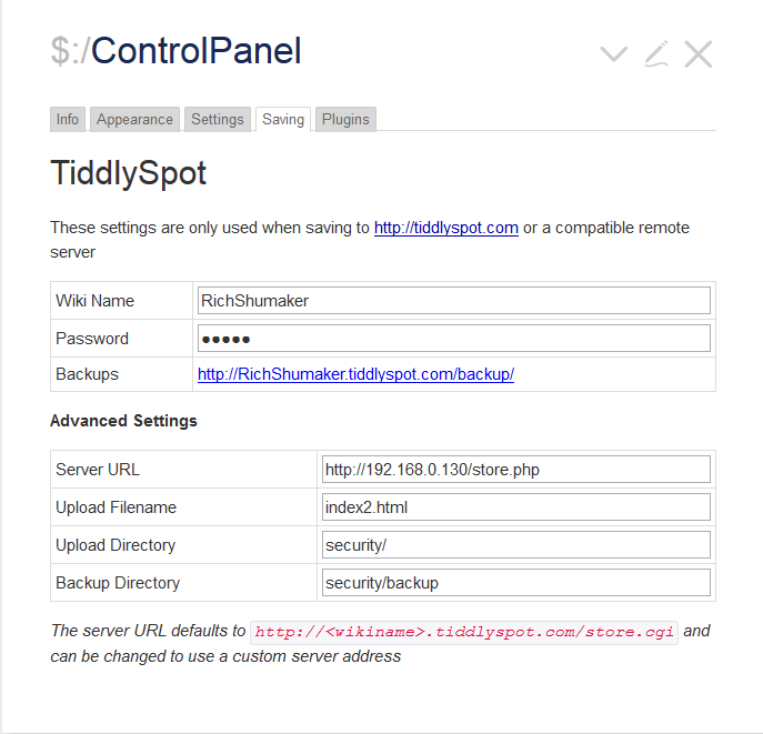In the Control Panel [[$:/ControlPanel]] under Saving Tab You change the 'Upload Filename' from 'index.html' to 'whatever.html'. When you save a new file will be created on the server(possible permissions issues again?) Now you go to 'whatever.html' and it is a duplicate of your 'index.html' page. So I guess I should have an 'empty.html' that I spawn off of. Except 'empty.html' would not have the configuration stuff. Need a very simple configuration empty.html now that I can spawn off of. Below is an image of the page I am discussing. Rich Shumaker <https://lh5.googleusercontent.com/-t7vWIgqsTR0/VK-XxXeUoVI/AAAAAAAADPY/rd5XNpUtRY8/s1600/BerryBootServerSetUp.png> -- You received this message because you are subscribed to the Google Groups "TiddlyWiki" group. To unsubscribe from this group and stop receiving emails from it, send an email to [email protected]. To post to this group, send email to [email protected]. Visit this group at http://groups.google.com/group/tiddlywiki. For more options, visit https://groups.google.com/d/optout.