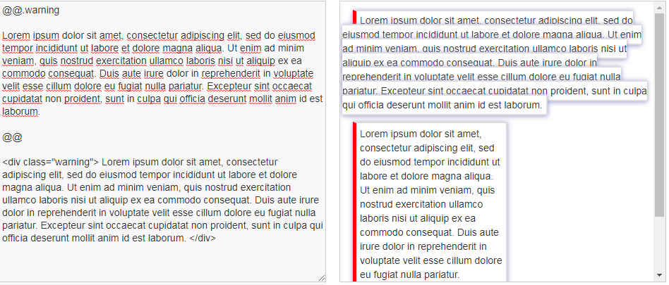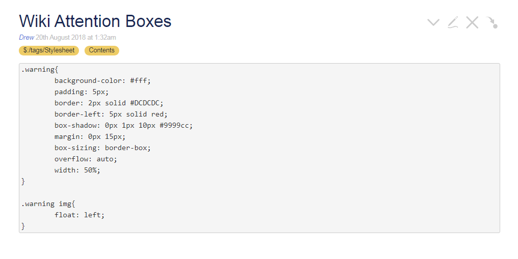 I've began a project to personally learn some basic CSS and start to use TiddlyWiki for school notes and whatever I want really. But I've run into a bit of an issue with my code. For fun before bed I was trying to create my own version of the Wiki Attention Boxes that you see on Wikipedia and it was coming along nicely but I wanted to start to use WikiText to denote the class rather than divs. And its weird! Apologizes if this post doesn't make any sense, hopefully the code issues will though. I'll share my stylesheet and code.