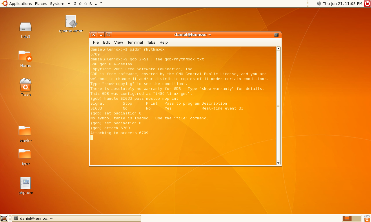 http://i103.photobucket.com/albums/m128/envyouraudience/gbd_attach.png as you can see, the (gdp) prompt did not show up again after i tried to attach the process. therefore, i must assume that gdb could not attah itself to the process. -- Rhythmbox crashes upon launch https://bugs.launchpad.net/bugs/121424 You received this bug notification because you are a member of Ubuntu Bugs, which is the bug contact for Ubuntu. -- ubuntu-bugs mailing list [email protected] https://lists.ubuntu.com/mailman/listinfo/ubuntu-bugs