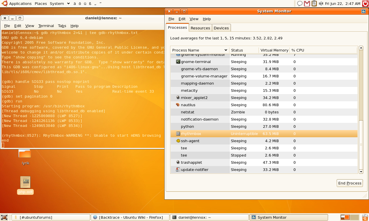 you need to read my comments more carefully. 1. i tried both methods (A. -attaching gdb to rhythmbox, and B.- running rhythmbox from gdb)