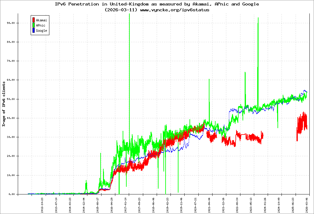 See also: https://www.akamai.com/uk/en/about/our-thinking/state-of-the-internet-report/state-of-the-internet-ipv6-adoption-visualization.jsp The periodic spikes are weekends. There’s just more IPv6 on residential vs. Enterprise networks. > > The UK and Belgium graphs look very similar (just ~50% v. ~18%). > But yes, this is only one source of data… > Eric Vyncke’s chart (https://www.vyncke.org/ipv6status/plotpenetration.php?country=gb) clearly shows that different measurement methodologies yield different results. Mat