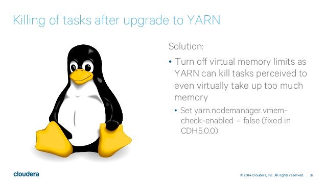 + Naga ________________________________ From: Ilya Karpov [[email protected]] Sent: Friday, September 25, 2015 14:34 To: [email protected] Subject: Re: Why would ApplicationManager request RAM more that defaut 1GB? Hi Manoj & Naga, I’m surprised but there is no such a property in CHD conf files (greped all *.xml in OSes where yarn lives!) I think that this property is set by Cloudera: http://image.slidesharecdn.com/yarnsaboutyarn-kathleenting112114-141125155911-conversion-gate01/95/yarns-about-yarn-28-638.jpg?cb=1416931543 (we use chd 5.4.5) 25 сент. 2015 г., в 10:19, Naganarasimha Garla <[email protected]<mailto:[email protected]>> написал(а): Hi Manoj & Ilya, >From the logs 2015-09-21 22:50:34,018 WARN org.apache.hadoop.yarn.server.nodemanager.containermanager.monitor.ContainersMonitorImpl: Container [pid=13982,containerID=container_1442402147223_0165_01_000001] is running beyond physical memory limits. This indicates that its increase in Physical memory limits and not virtual limits due to which container was killed and also probability that Container Monitor would wait till vmem is 3.4 GB when limit is 2.1 GB to kill it is less. Vmem includes overall memory limits including the files opened etc ... but seems like virtual mem check in your setup seems to be disabled. please check for configuration as mentioned by Manoj "yarn.nodemanager.vmem-check-enabled " to cross verify On Fri, Sep 25, 2015 at 12:15 PM, Ilya Karpov <[email protected]<mailto:[email protected]>> wrote: Hello, Manoj the actual question is why this happens 24 сент. 2015 г., в 20:39, manoj <[email protected]<mailto:[email protected]>> написал(а): Hello IIya, Looks like the Vmem usage is going above the above 2.1 of Pmem times thats why the container is getting killed, 1.0 GB of 1 GB physical memory used; 3.4 GB of 2.1 GB virtual memory used By default Vmem is set to 2.1 times of the Pmem. Looks like your job is taking 3.4GB! You can change the ratio by setting in Yarn-site.xml: yarn.nodemanager.vmem-pmem-ratio You can optionally disable this check by setting following to false: yarn.nodemanager.vmem-check-enabled Thanks, -Manoj On Wed, Sep 23, 2015 at 12:36 AM, Ilya Karpov <[email protected]<mailto:[email protected]>> wrote: Great thanks for your reply! >1. Which version of Hadoop/ YARN ? Hadoop(command: hadoop version): Hadoop 2.6.0-cdh5.4.5 Subversion http://github.com/cloudera/hadoop -r ab14c89fe25e9fb3f9de4fb852c21365b7c5608b Compiled by jenkins on 2015-08-12T21:11Z Compiled with protoc 2.5.0 >From source with checksum d31cb7e46b8602edaf68d335b785ab This command was run using /opt/cloudera/parcels/CDH-5.4.5-1.cdh5.4.5.p0.7/jars/hadoop-common-2.6.0-cdh5.4.5.jar Yarn (command: yarn version) prints exactly the same. >2. From the logs is it getting killed due to over usage of Vmem or Physical >memory ? Because of over usage of Physical memory. Last seconds of life: 2015-09-21 22:50:34,017 INFO org.apache.hadoop.yarn.server.nodemanager.containermanager.monitor.ContainersMonitorImpl: Memory usage of ProcessTree 13982 for container-id container_1442402147223_0165_01_000001: 1.0 GB of 1 GB physical memory used; 3.4 GB of 2.1 GB virtual memory used 2015-09-21 22:50:34,017 WARN org.apache.hadoop.yarn.server.nodemanager.containermanager.monitor.ContainersMonitorImpl: Process tree for container: container_1442402147223_0165_01_000001 has processes older than 1 iteration running over the configured limit. Limit=1073741824, current usage = 1074352128 2015-09-21 22:50:34,018 WARN org.apache.hadoop.yarn.server.nodemanager.containermanager.monitor.ContainersMonitorImpl: Container [pid=13982,containerID=container_1442402147223_0165_01_000001] is running beyond physical memory limits. Current usage: 1.0 GB of 1 GB physical memory used; 3.4 GB of 2.1 GB virtual memory used. Killing container. Dump of the process-tree for container_1442402147223_0165_01_000001 : |- PID PPID PGRPID SESSID CMD_NAME USER_MODE_TIME(MILLIS) SYSTEM_TIME(MILLIS) VMEM_USAGE(BYTES) RSSMEM_USAGE(PAGES) FULL_CMD_LINE |- 13994 13982 13982 13982 (java) 4285 714 3602911232 261607 /opt/jdk1.8.0_60/bin/java -Dlog4j.configuration=container-log4j.properties -Dyarn.app.container.log.dir=/var/log/hadoop-yarn/contai ner/application_1442402147223_0165/container_1442402147223_0165_01_000001 -Dyarn.app.container.log.filesize=0 -Dhadoop.root.logger=INFO,CLA -Djava.net.preferIPv4Stack=true -Xmx825955249 org.apache.had oop.mapreduce.v2.app.MRAppMaster |- 13982 13980 13982 13982 (bash) 0 0 14020608 686 /bin/bash -c /opt/jdk1.8.0_60/bin/java -Dlog4j.configuration=container-log4j.properties -Dyarn.app.container.log.dir=/var/log/hadoop-yarn/container/application_1442402147223_0165/container_1442402147223_0165_01_000001 -Dyarn.app.container.log.filesize=0 -Dhadoop.root.logger=INFO,CLA -Djava.net.preferIPv4Stack=true -Xmx825955249 org.apache.hadoop.mapreduce.v2.app.MRAppMaster 1>/var/log/hadoop-yarn/container/application_1442402147223_0165/container_1442402147223_0165_01_000001/stdout 2>/var/log/hadoop-yarn/container/application_1442402147223_0165/container_1442402147223_0165_01_000001/stderr 2015-09-21 22:50:34,018 INFO org.apache.hadoop.yarn.server.nodemanager.containermanager.monitor.ContainersMonitorImpl: Removed ProcessTree with root 13982 2015-09-21 22:50:34,025 INFO org.apache.hadoop.yarn.server.nodemanager.containermanager.container.Container: Container container_1442402147223_0165_01_000001 transitioned from RUNNING to KILLING 2015-09-21 22:50:34,025 INFO org.apache.hadoop.yarn.server.nodemanager.containermanager.launcher.ContainerLaunch: Cleaning up container container_1442402147223_0165_01_000001 2015-09-21 22:50:34,075 WARN org.apache.hadoop.yarn.server.nodemanager.DefaultContainerExecutor: Exit code from container container_1442402147223_0165_01_000001 is : 143 >3. Can you run " jmap -histo -F <PID of AM container>" and share the heap dump >result? I’ll try to do it asap. >4. If possible can you pastebin the AM logs? yes, https://drive.googl
