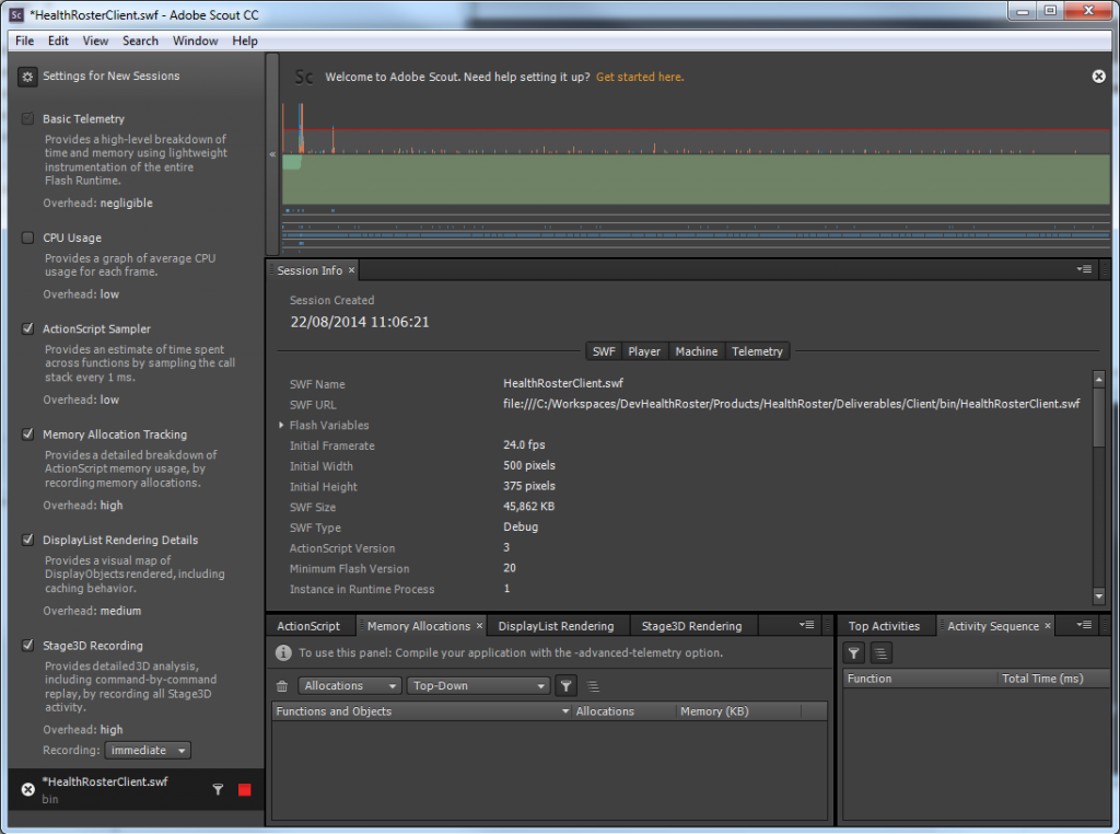 Hiya, We have a memory leak in our application and I'm trying to get Adobe Scout working against it so I can start analysing what is happening with the memory.