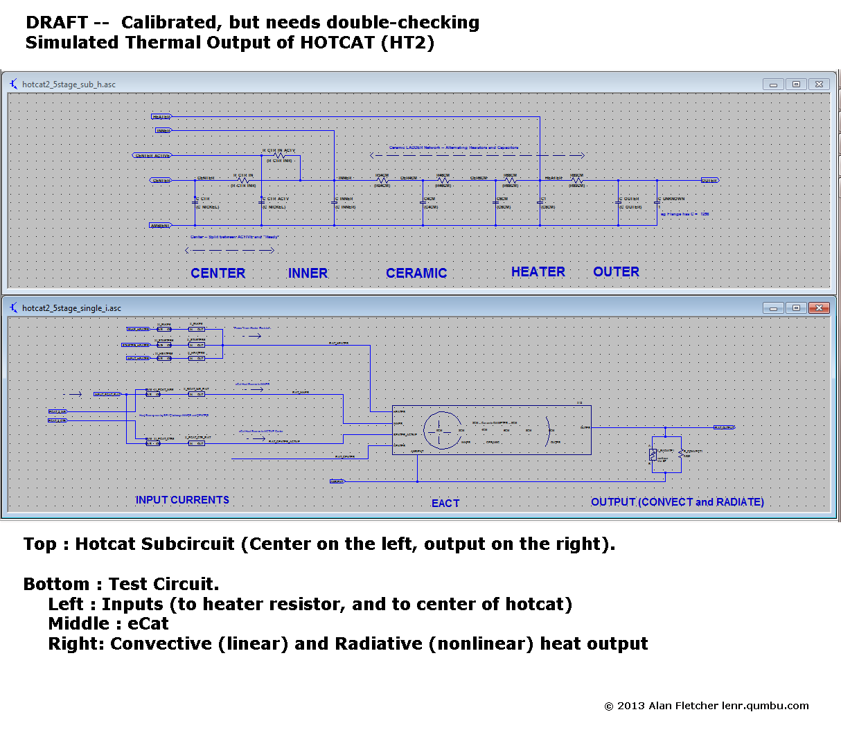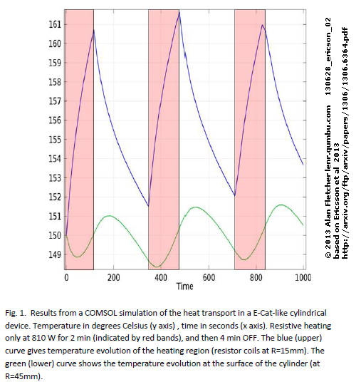 Funny you asked ..... here's my current spice model : http://lenr.qumbu.com/web_hotcat_spice/130625_spice_18.png Here's the Levi curve : http://lenr.qumbu.com/web_hotcat_pics/130601_levi_12A.png Here's the Ericsson curve : http://lenr.qumbu.com/web_hotcat_spice/130628_ericson_02.png Here's my simulation with HEATER power only, applied to the OUTSIDE (top) and INSIDE (bottom) http://lenr.qumbu.com/web_hotcat_spice/130625_spice_20.png Their model isn't calibrated -- mine is. Allowing for the different voltages, the SHAPE of the Ericson curve clearly shows that the "sine-like" wave only occurs if excess pulsed power comes from the INSIDE, not the OUTSIDE.