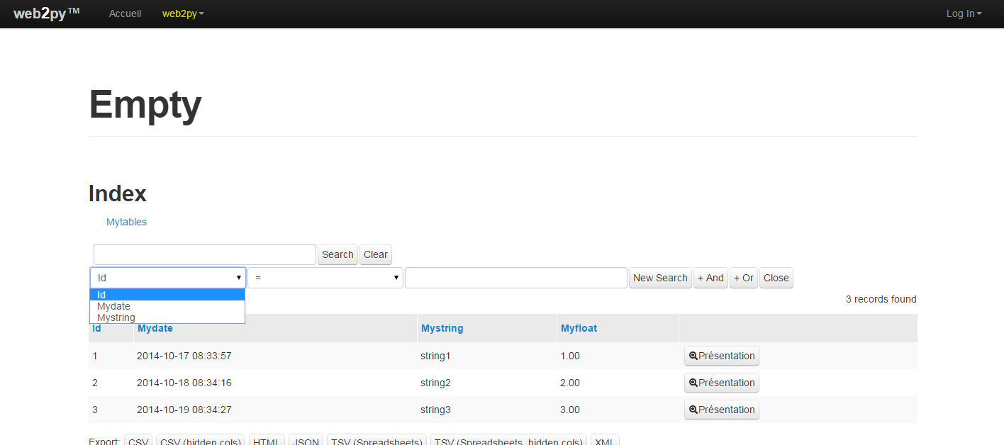 >> grid = SQLFORM.smartgrid(db.myTable)