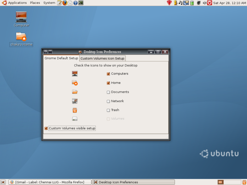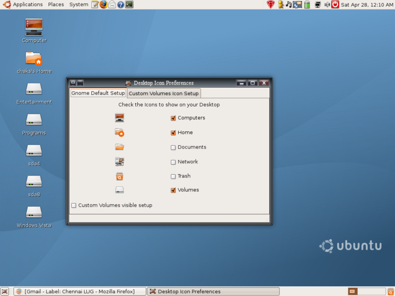 *What are the improvements* Enabled to show/hide specific volumes in the desktop. So now , if the user wants to hide *sda4* and have only *sda2* on the desktop, the user can do it now *To Install* - tar xjvf dip-0.1.tar.bz2 - cd dip-0.1 - sudo ./setup install (for installing) - sudo ./setup remove (for un-installing) - Run it from menu System-->Preferences-->Desktop Icons Preferences *Limitations* 1) You cant keep custom names or icons for volumes shown on your desktop. So as of now, if its *sda2*, the icon name gets created as sda2 2) If you change the created desktop volume entry's name , the desktop-icons-preferences does not keep track of the name changes, however, you can change the icon 3) As per the standard, this works only for partitions mounted at */media*and thus the default Ubuntu setup will work without any flaws. *Things to do* 1) Still haven't created any source forge or launchpad entries 2) The GUI has to be improved a bit 3) deb package has to be created 4) Translation to various languages 5) Enable to show other partitions mounted in other locations than /media (is it really needed??) 6) To get the label of the partition and display instead of *sda4* or *sda5* Please report your bugs and what you think of the improvement. Here are some screen shots too attached http://i33.photobucket.com/albums/d74/chaks_2k/Screenshot-2-1.png http://i33.photobucket.com/albums/d74/chaks_2k/Screenshot-1-1.png http://i33.photobucket.com/albums/d74/chaks_2k/Screenshot.png -- Regards, C.C.Chakkaradeep, http://chakkaradeep.wordpress.com -- "Sometimes it's better not to ask - or to listen - when people tell you something can't be done. I didnt ask for permission or approval. I just went ahead and did it." - from "Direct from Dell"
